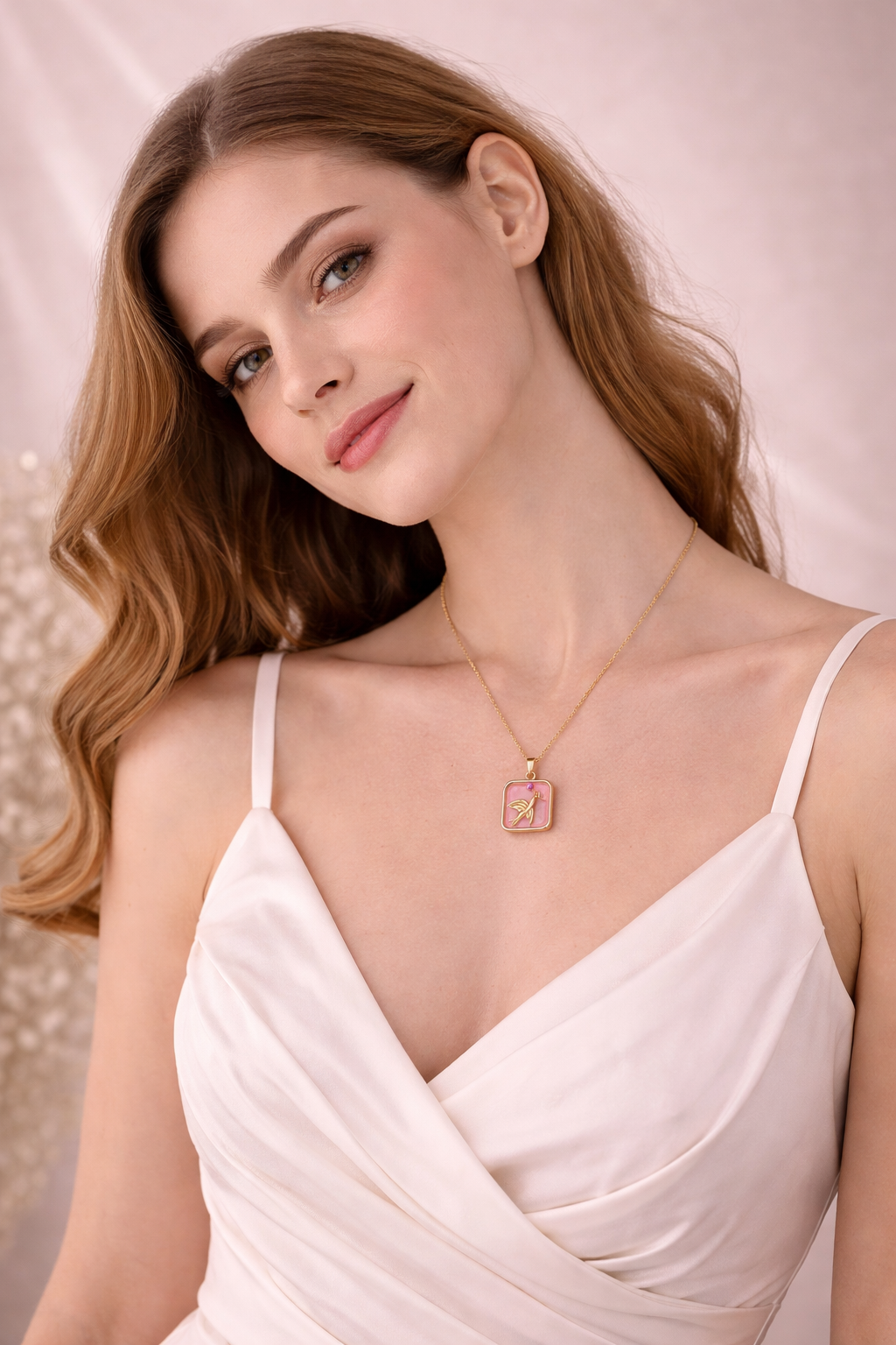 Styled on a full model in a studio setup, this necklace enhances the outfit effortlessly and delivers a luxury fashion photoshoot appeal. The subtle pink tone of the pendant adds a feminine charm while maintaining a modern, minimal aesthetic.